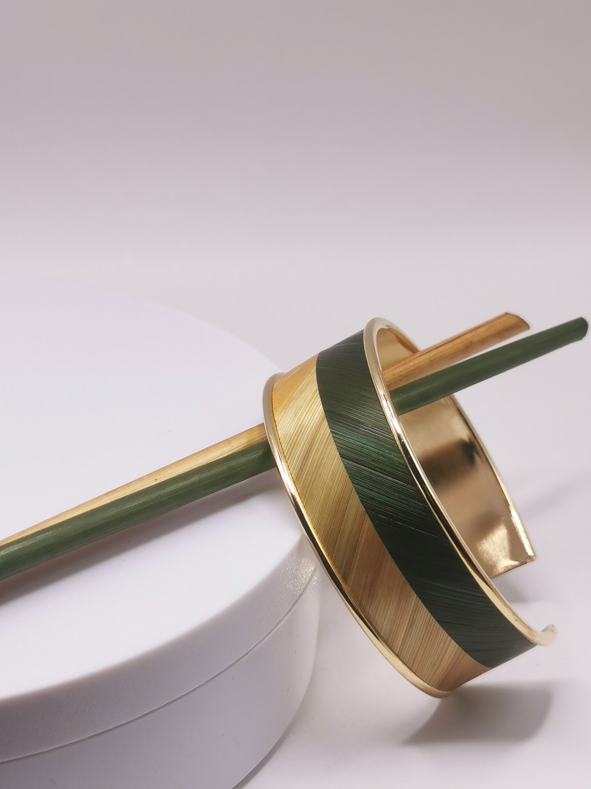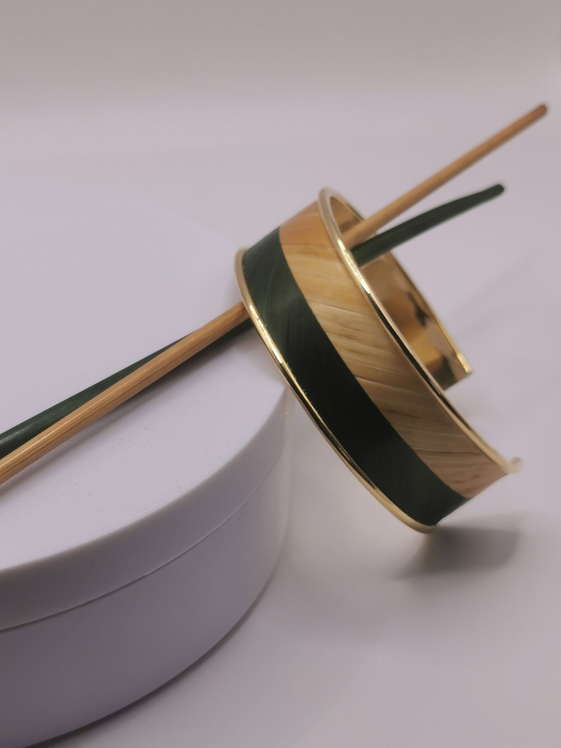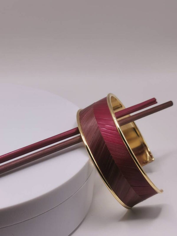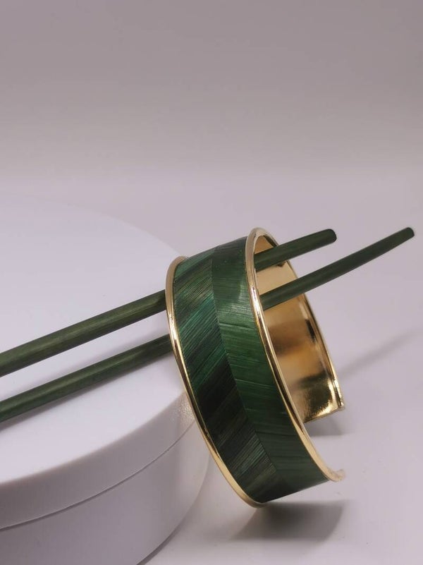 Bracelet manchette laiton - décor en chevron marqueterie de paille - taille unique largeur 20mm