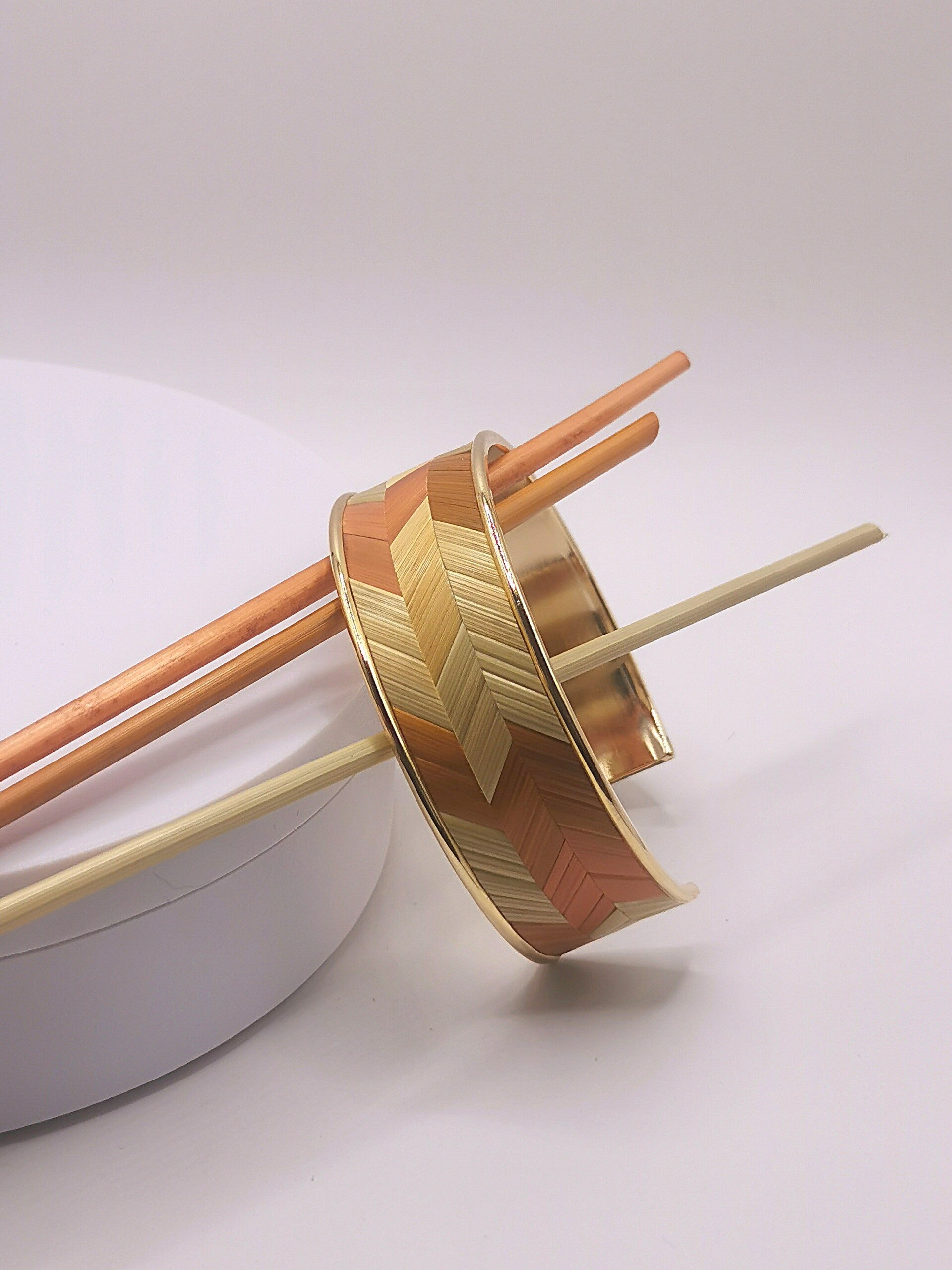 Bracelet manchette laiton plaqué or 24 carats - décor marqueterie de paille - taille unique largeur 20mm