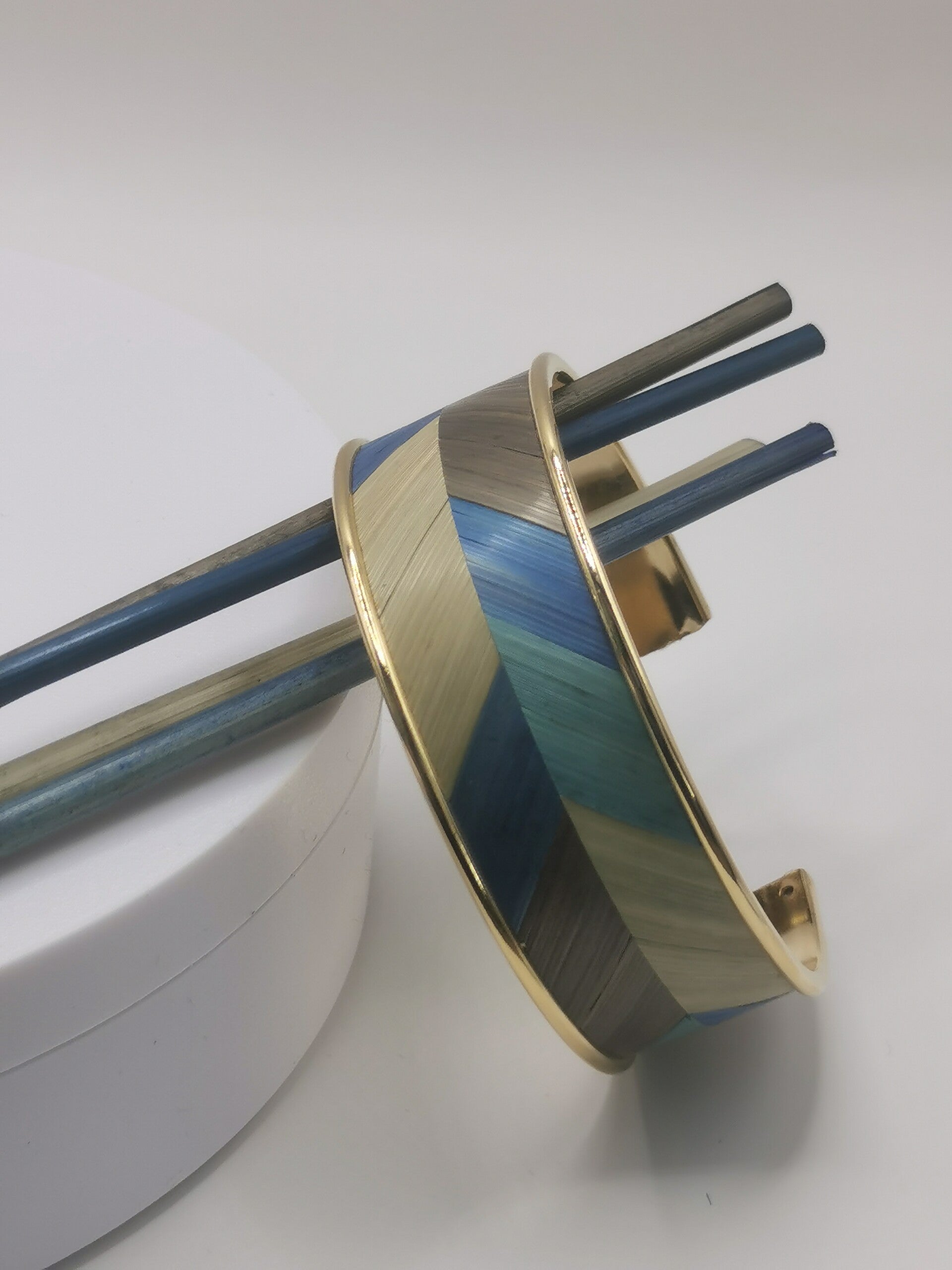Bracelet manchette laiton  - décor en chevron marqueterie de paille - taille unique largeur 20mm