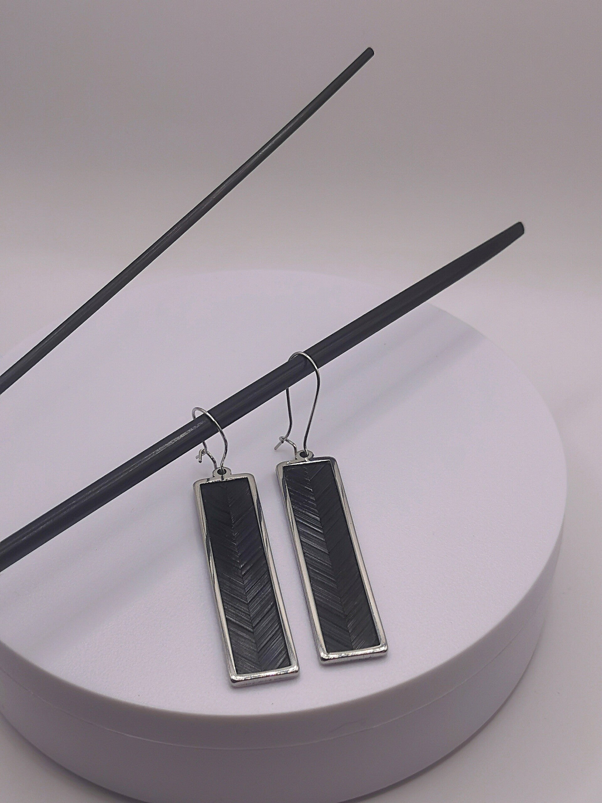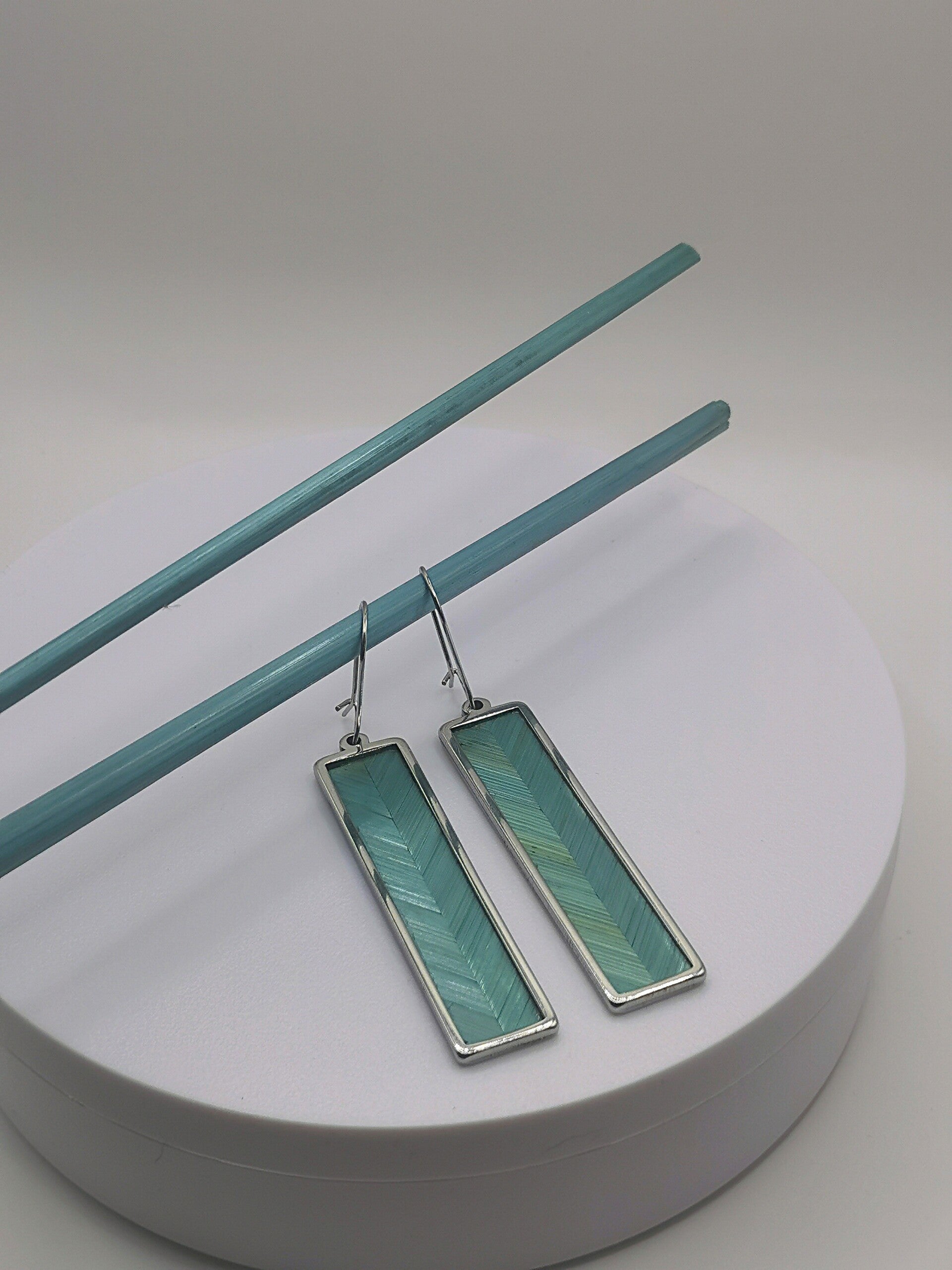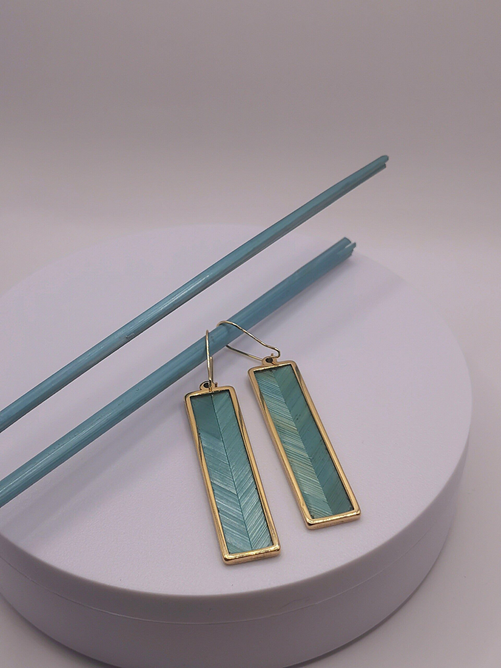 Boucles d'oreilles Acier Inoxydable finition doré ou argent avec décor chevrons unis en marqueterie de paille - taille unique - largeur 13mm Hauteur 56mm (Hauteur totale avec la dormeuse 75mm).