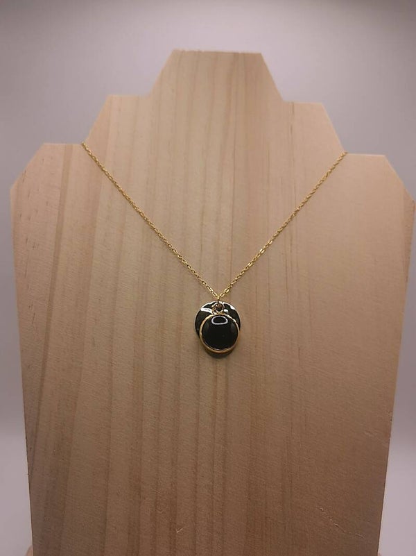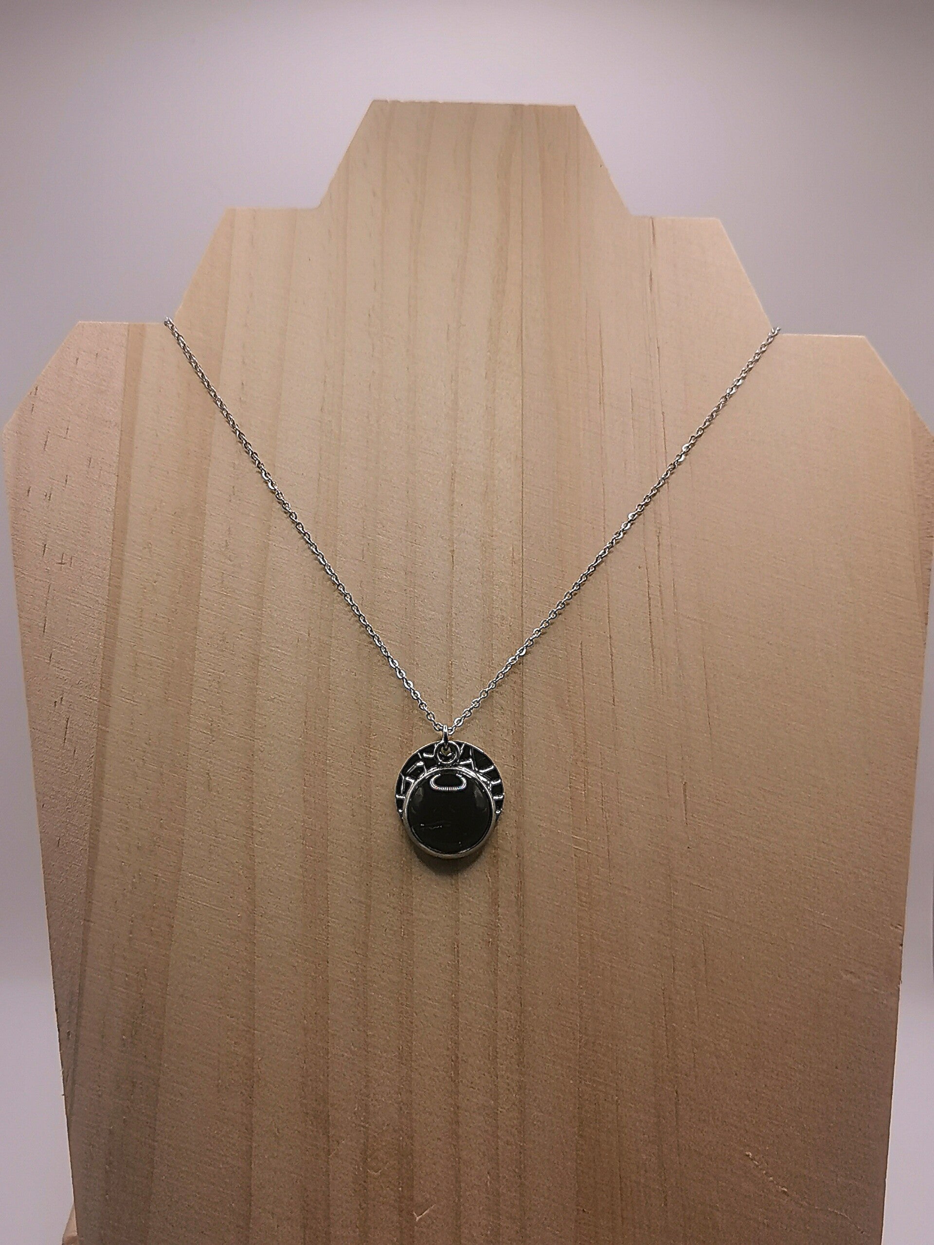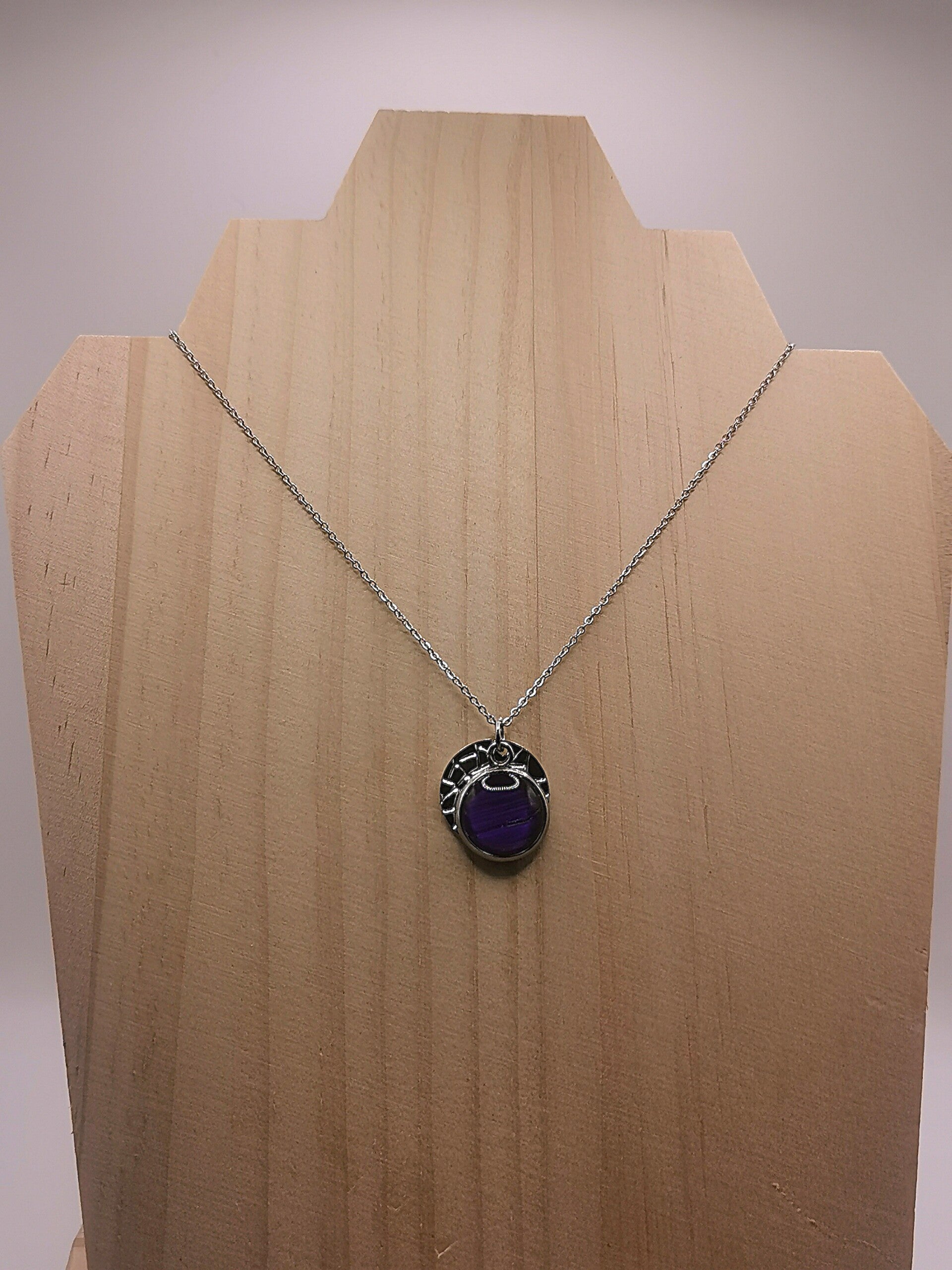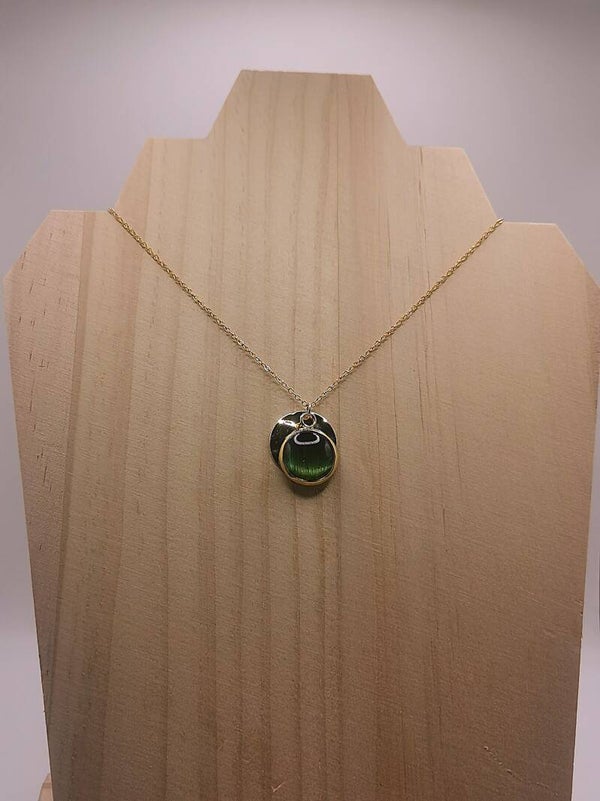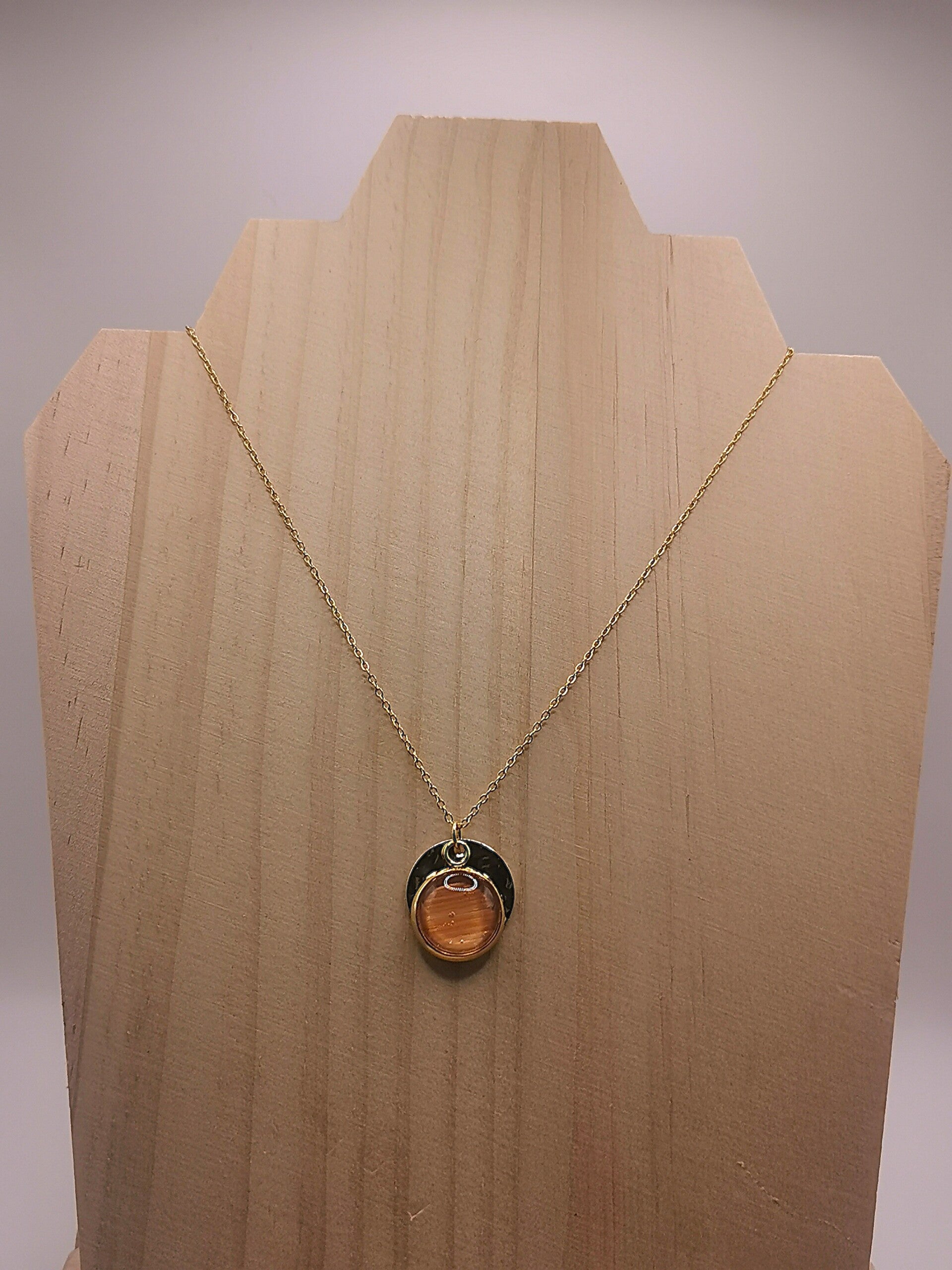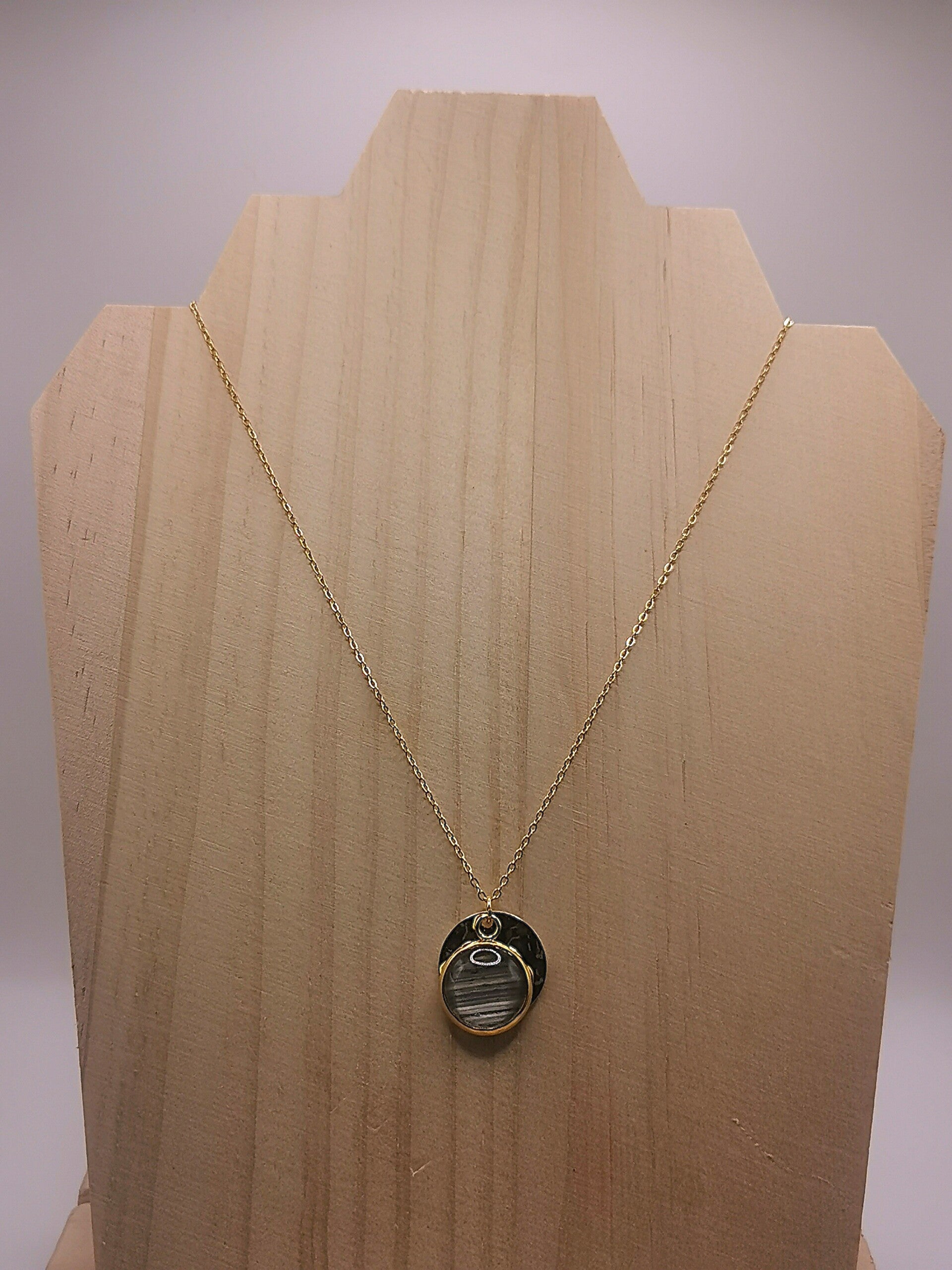 Collier en acier inoxydable avec un double médaillon, 1 médaillon diamètre 14mm martelé et 1 médaillon diamètre 12mm recouvert d'un cabochon en verre serti de paille de seigle de couleur.